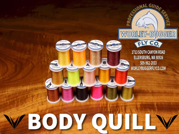The VEEVUS Body Quills offers a new dimension of thread bodies. A synthetic material that is different than other quill materials. When you coat this thread material with UV resin, you’ll be amazed at the bodies you can create. Each